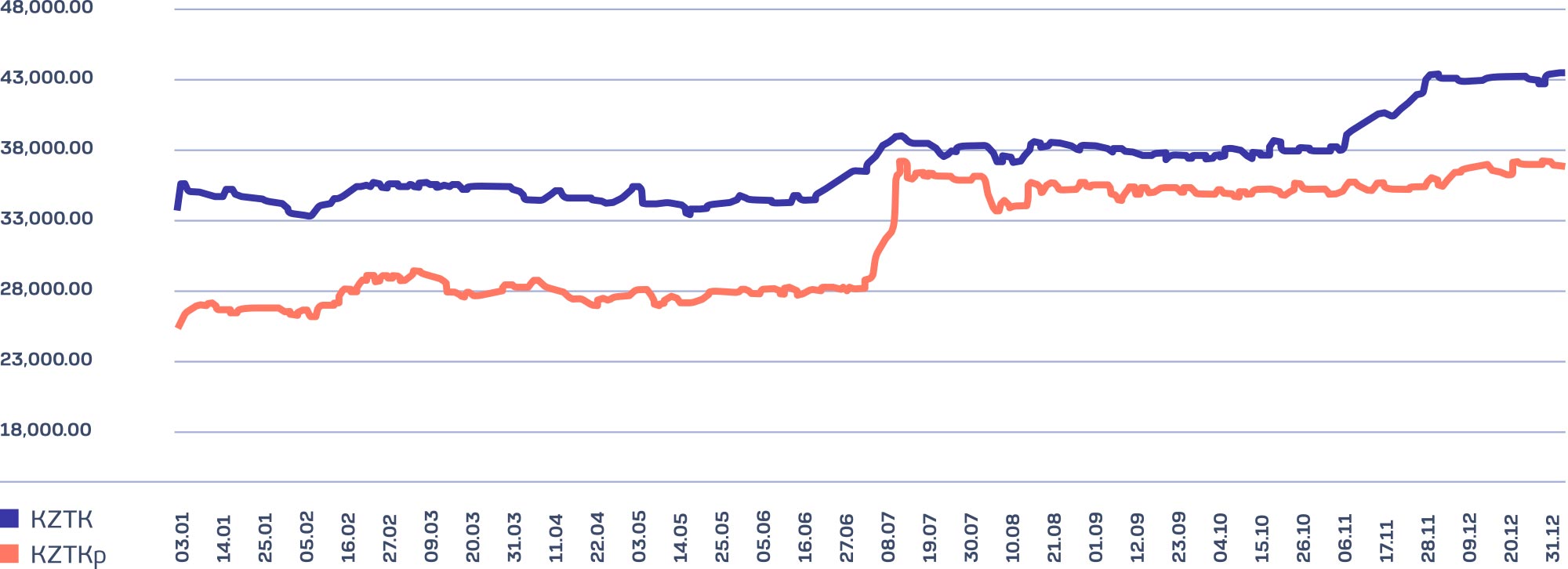 At the beginning of 2024, news emerged regarding a planned transaction for the sale of MT-S LLP between Kazakhtelecom JSC and PIH Communication LLC, which triggered a rise in the Company’s share prices. On 18 June 2024, the Minister of Digital Development announced the estimated value of the transaction, further accelerating the growth of both ordinary and preferred shares. Throughout the year, the Company’s share prices continued to increase. As of the last trading day of December 2024, the price of Kazakhtelecom JSC’s ordinary shares (ISIN KZ0009093241) on the Kazakhstan Stock Exchange stood at KZT 43,778.00, while the price of its preferred shares (ISIN KZ0009094645) reached KZT 36,900.00.