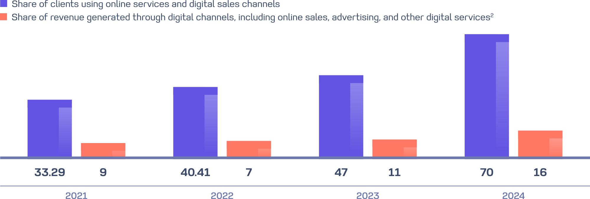 2 The figures for 2021–2023 regarding the share of revenue generated through digital channels have been restated.