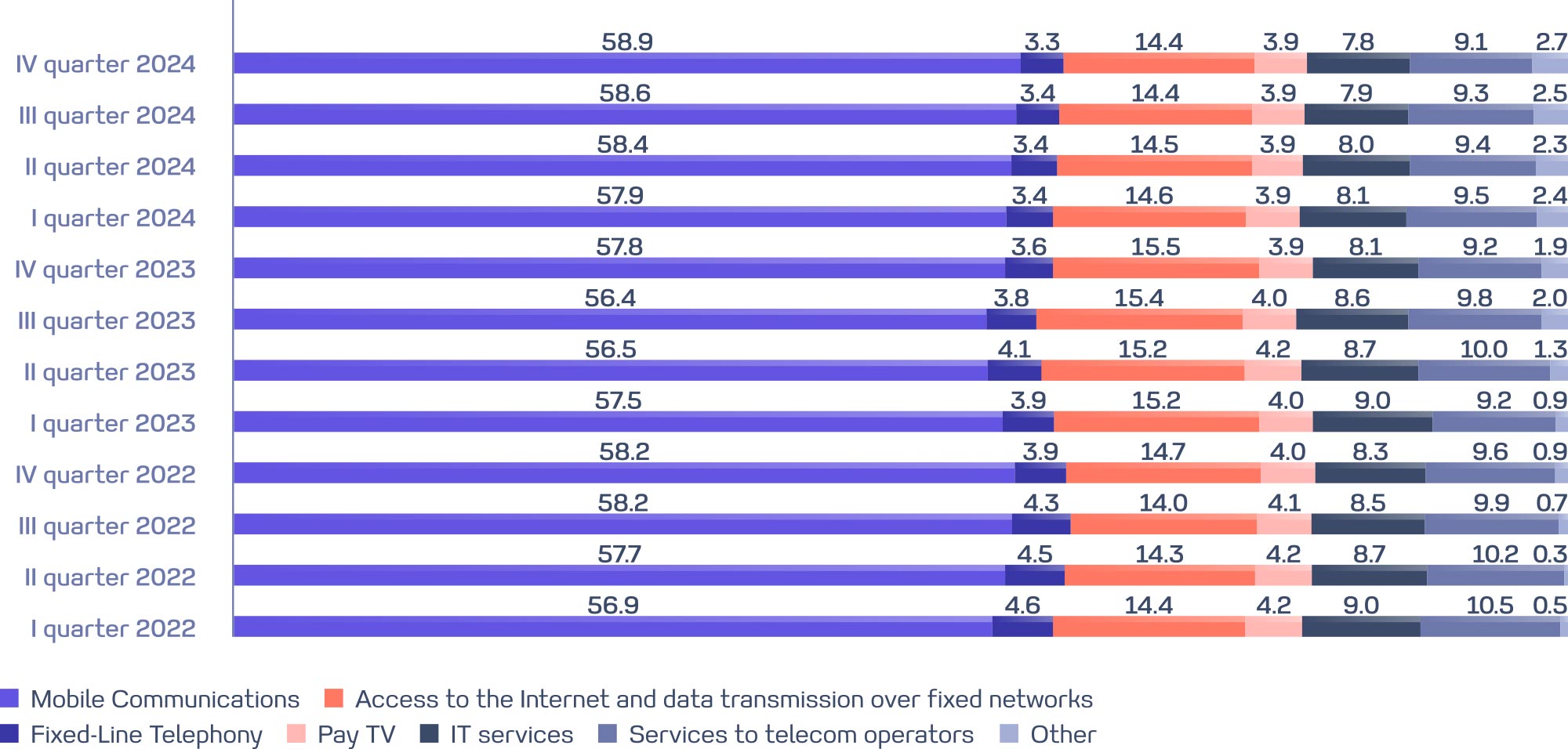 Fixed broadband and data transmission services (15%), as well as IT services (8%), continue to contribute to the overall market, particularly due to the growth of cloud solutions and digital services. Overall, the market structure by service type remained largely unchanged compared to 2023, although there is a gradual shift toward higher value-added services.
