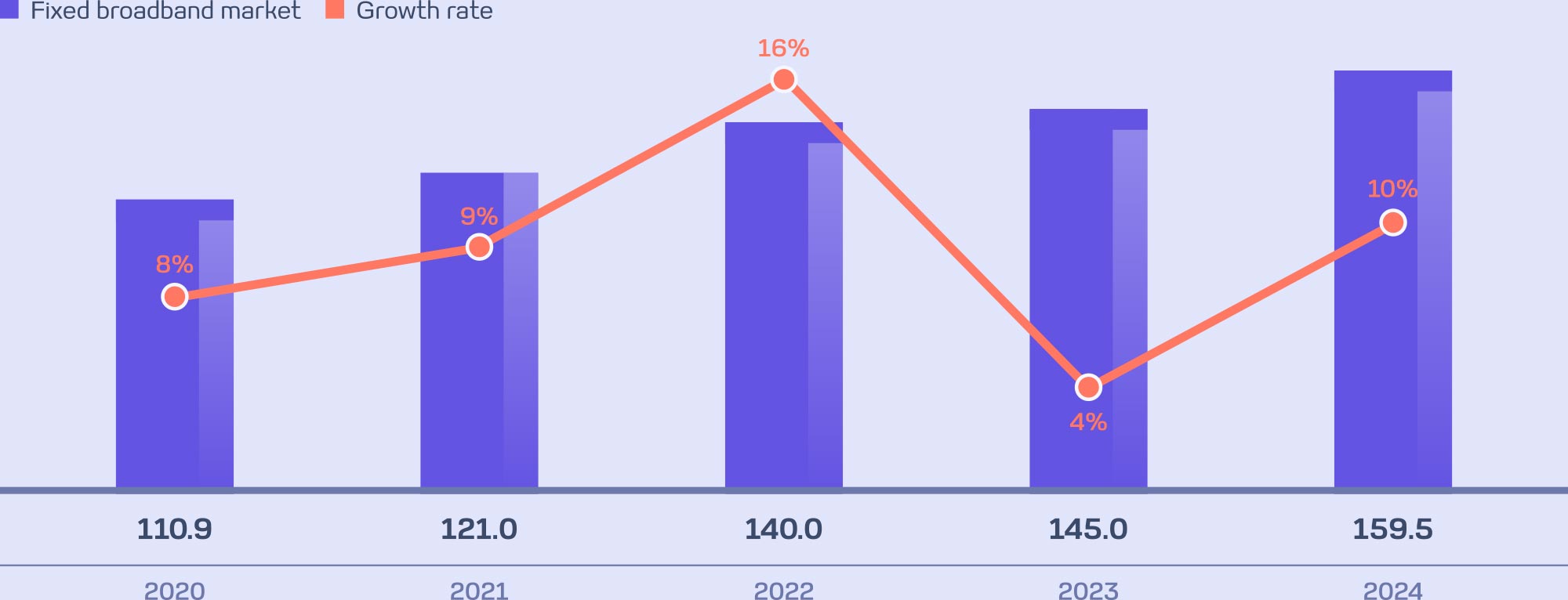 The broadband access market continues to grow year over year. In major cities, internet providers aim to increase subscriber profitability by migrating users from ADSL connections to FTTx and GPON networks, which offer higher speeds and broader service packages at corresponding costs. Providers delivering universal services in rural areas receive state subsidies to compensate for lost revenue due to the application of special tariffs. The estimated volume of the fixed broadband market in 2024 was KZT 159.5 billion, representing a 10% increase compared to the previous year.