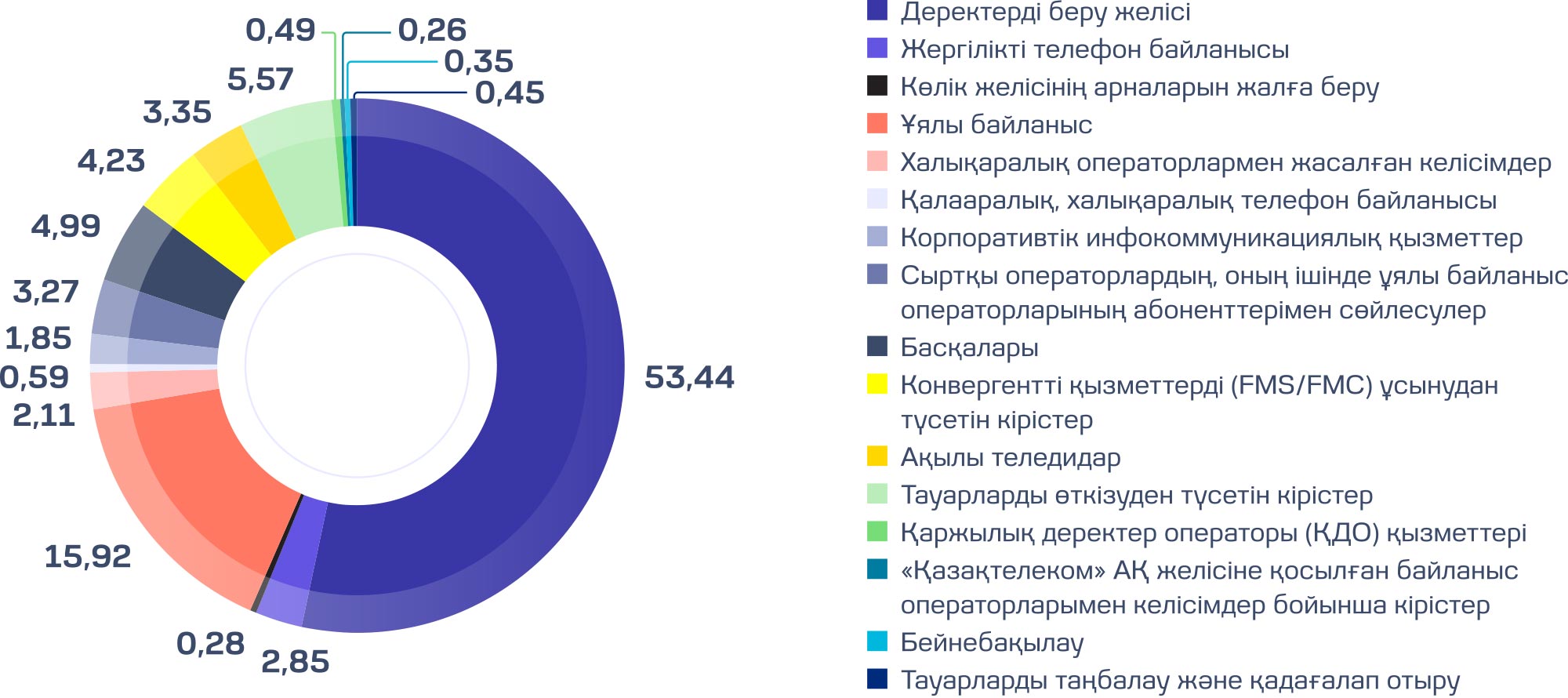 • Деректерді беру желісі қызметтерінен түскен табыс — жалпы табыс құрылымының 53,4%-ын құрады;
