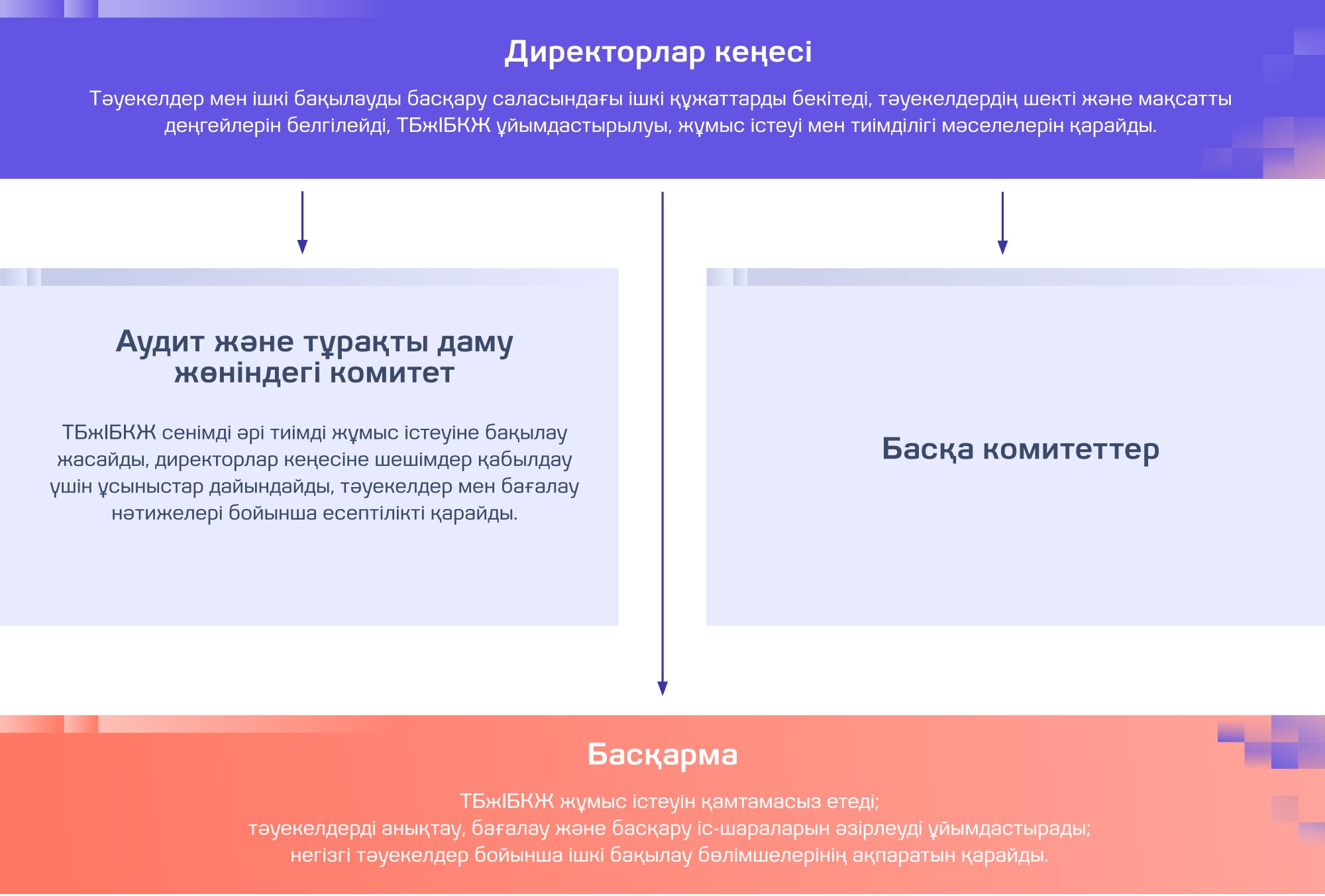 Компанияның ТБжІБКЖ жұмыс істеу моделі корпоративтік басқарудың барлық деңгейлерін тәуекелдер мен сәйкессіздіктерді уақтылы сәйкестендіру және басқару жөніндегі қызметке тартуды көздейді және басқарудың стратегиялық және тактикалық деңгейлерінде ТБжІБКЖ компоненттерін құруды, сондай-ақ оның жұмыс істеуін тәуелсіз бағалау мен қадағалауды қамтамасыз етуді қамтиды.