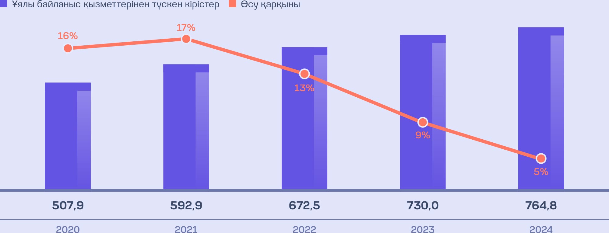 2024 жылдың қорытындысы бойынша Қазақстандағы ұялы байланыс нарығының көлемі 764,8 млрд теңгені құрады, бұл өткен жылмен салыстырғанда 5%-ға жоғары.