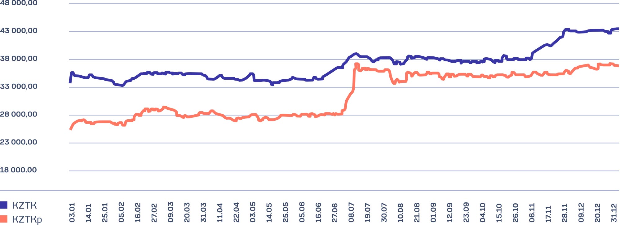 В течение 2024 года минимальная цена на простые акции АО «Казахтелеком» достигала 33 303,00 тенге и на привилегированные акции АО «Казахтелеком» достигала 24 797,00 тенге.