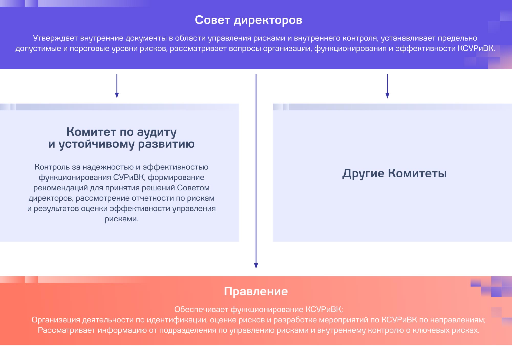 Модель функционирования КСУРиВК Компании предполагает вовлечение всех уровней корпоративного управления в деятельность по своевременной идентификации и управлению рисками и несоответствиями и включает выстраивание компонентов КСУРиВК на стратегическом и тактическом уровнях управления, а также обеспечение независимой оценки и надзора за его функционированием.